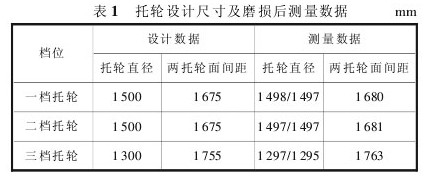 初次振動(dòng)時(shí),經(jīng)分析判斷,振動(dòng)原因是兩托輪磨損引起大、小齒輪齒頂間隙變小,造成頂齒。測(cè)量各檔兩托輪外徑之間距離,也確實(shí)比安裝時(shí)的變大了(見表1),且各托輪磨損情況也有差別。