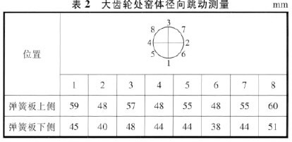 從表2看出,窯體在第6和對(duì)稱的第8點(diǎn)的徑向跳動(dòng)最大。由此我們判斷由于窯體大齒輪位置產(chǎn)生彎曲,大齒輪每圈運(yùn)行到第6點(diǎn)前后位置時(shí),頂在小齒輪磨出的凸臺(tái)上,使大齒輪產(chǎn)生劇烈顫動(dòng)。